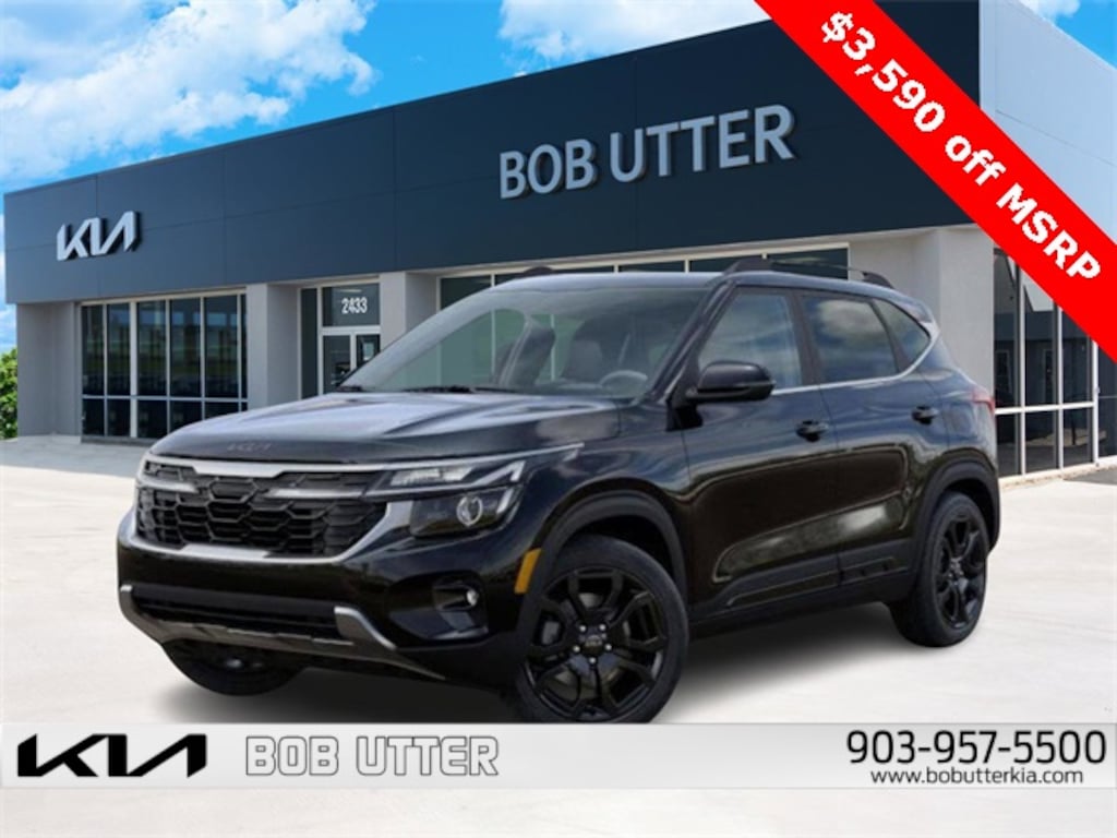 'Here at Bob Utter Kia, we want you to feel like you are a part of our family. Our Internet Sales Team makes purchasing a vehicle quick and easy! Let us help you with your new Kia TODAY! You can view all of our inventory at www.bobutterkia.com. Contact the Internet Sales Dept. at 903-957-5500 or sales@bobutterford.com. All vehicles may be equipped with dealer added accessories. Price of accessories may not be displayed. Please verify added accessories and price with dealer. Disclaimer: This vehicle may have sustained a minor hail event, which may have been repaired. All damage is cosmetic only and does not affect the mechanical condition or performance of the vehicle. Photos are available upon request. Pricing has been adjusted accordingly to reflect this damage. 2025 Kia Seltos X-Line I4 AWD Fusion Black 24/27 City/Highway MPG Price includes: $1500 - KFA Dealer Choice Program: $1500 discount and 5.25% APR for 36 months. $30.08 per $1000 financed. Available to well qualified buyers who finance through Kia Finance America. 506. Exp. 12/01/2025 $750 - Sticker Sales Event Retail Bonus Cash. Exp. 12/01/2025